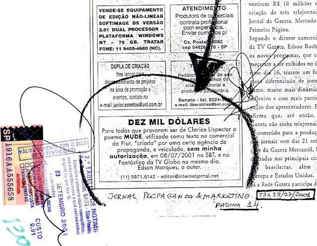 Lispector, não checou as fontes, usou o poema para "criar" um comercial para a Fiat do Brasil, e divulgou releases à mídia